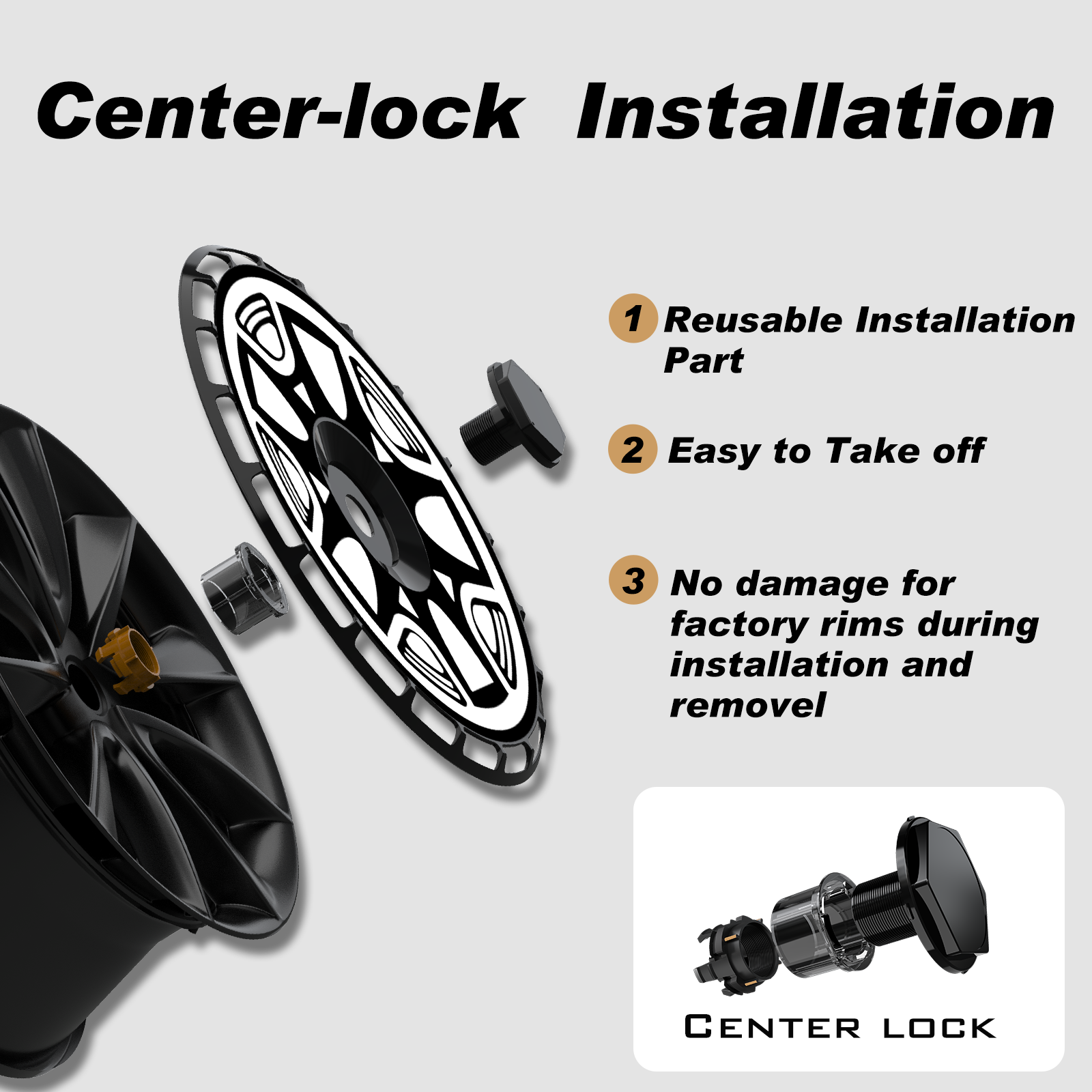 • Unique Installation - These rim protectors for wheel feature the center lock design that simply snap on the center lock and rotate it to secure the covers in place.